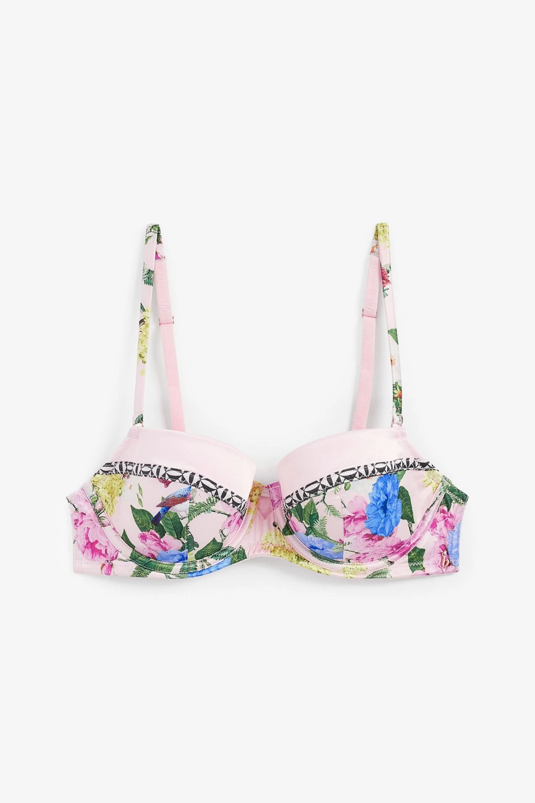 This gorgeous B by Ted Baker balcony bra is adorned with a pink floral bird print with geo contrast binding. Designed with underwire, light padding, split strap detail and finished off with branded hardware.
