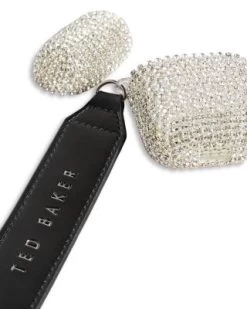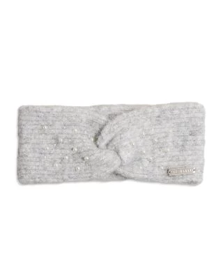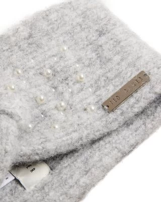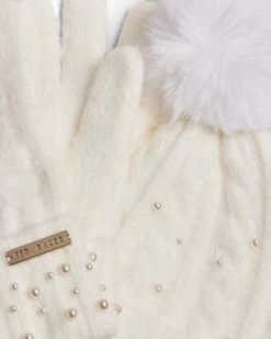 - Allover cable knit with imitation pearl embellishments and metal logo plate