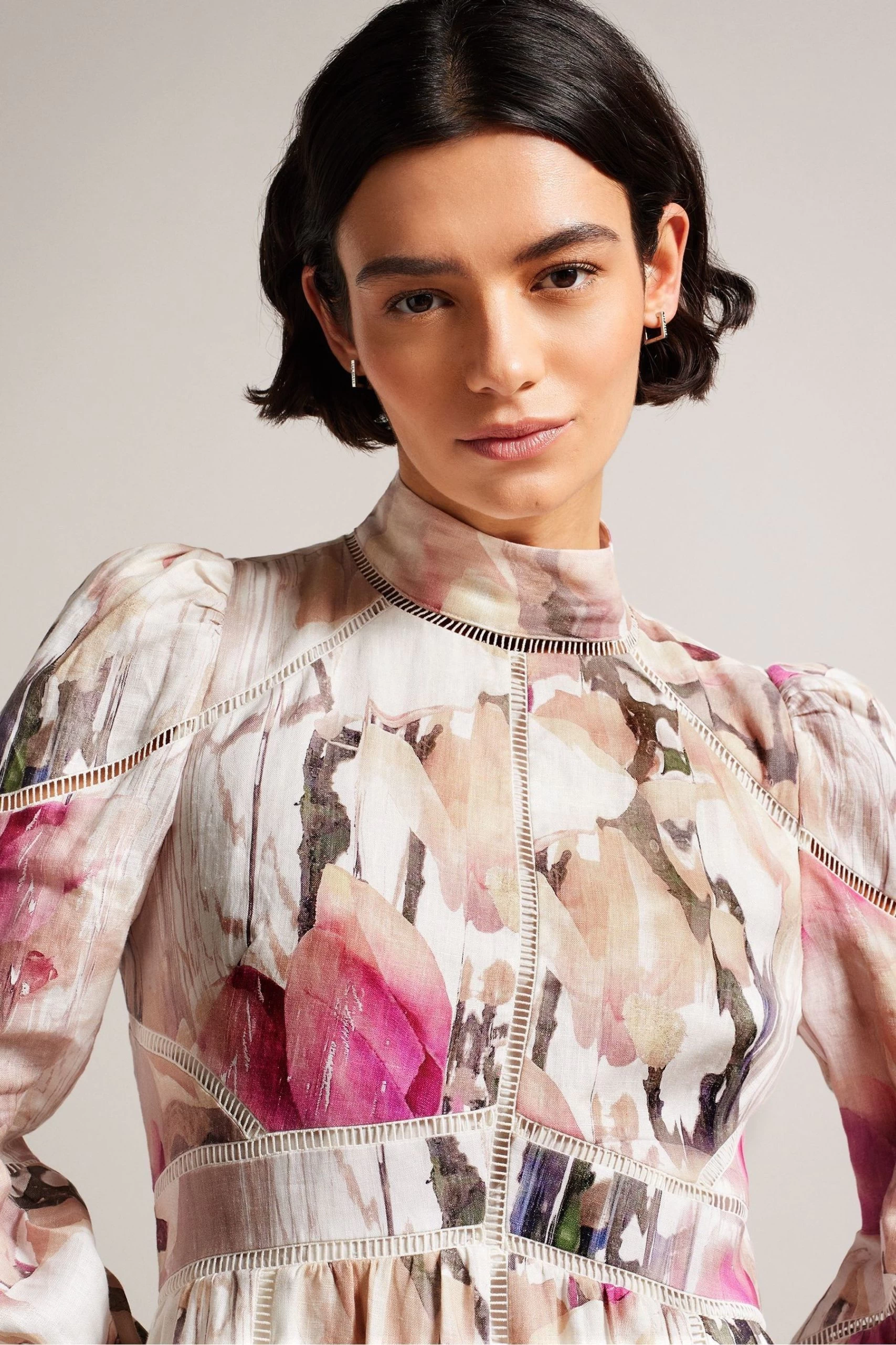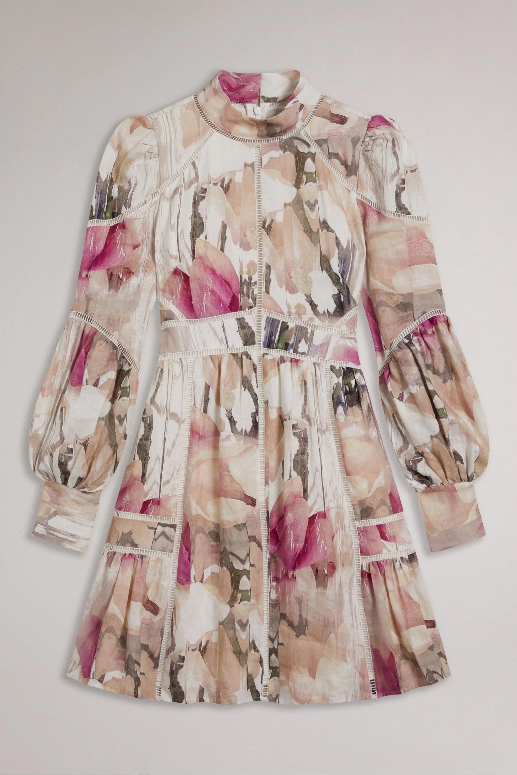 The FLEURZ dress with our blurred floral print is a beautifully delicate A-line with a high neck and ladder lace detailing cut from lightweight and breathable linen. Either go classic or wear with a leather jacket and boots to toughen up the look.