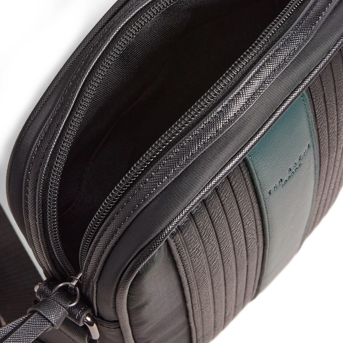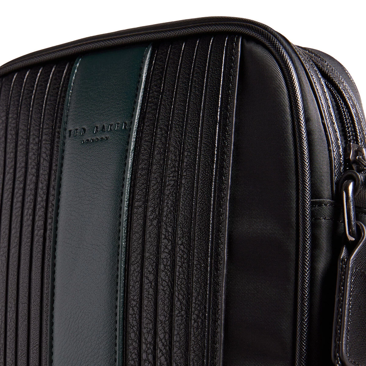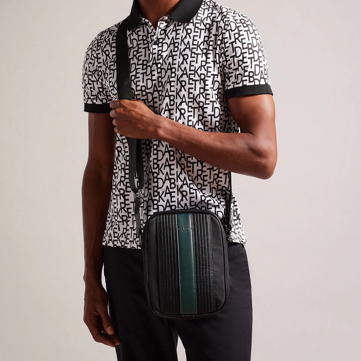 Made from 100% recycled polyester, this stylish cross body bag is the perfect place to store your essentials whilst you are out and about. The design showcases a striking ribbed design down the front in black faux leather. In the centre of this is a contrasting dark green stripe, subtly embossed onto this is the Ted Baker logo.